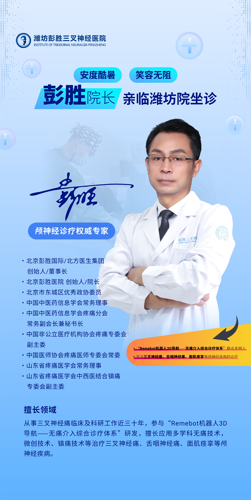 北京彭胜医院院长、颅神经诊疗知名专家彭胜亲临潍坊院区坐诊,为众多饱受病痛困扰的患者带来了希望。
